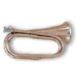 Bb Regulation bugle standard model copper made, heavy gauge, fully re-enforced with brass at all vital points, complete with chain and mouth piece, lacquer finish. weight 24 oz. specify if required High or Low pitch.